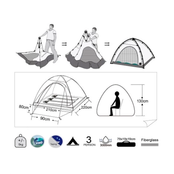 Campingtelt med plass til tre personer."Flash-touch" systemet gjør at teltet settes opp på ca 30sekunder. Ved at yttertelt, innertelt og stenger sitter festet sammen gjør det at oppsett og nedpakking går meget raskt.